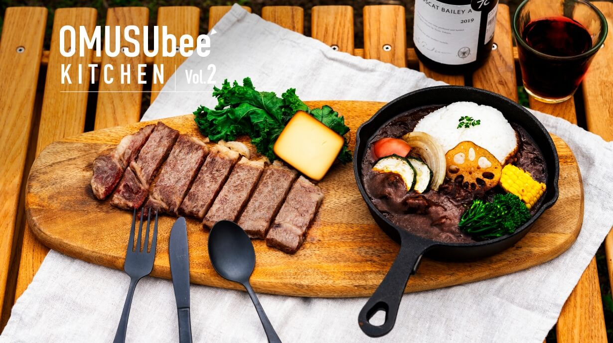 世界中の食通を唸らせる和牛の中でも、3大ブランドのひとつに数えられる近江牛。そんな超高級なお牛さまを、アウトドアで味わいたい! OMUSUbeeオンラインショップでも販売されている大倉クラブ&ホテルズオリジナルブランド“近江大倉和牛”のサーロインステーキと、同じく自社開発の“近江牛カレー”の2品で、その絶品のお味を存分に味わいます。